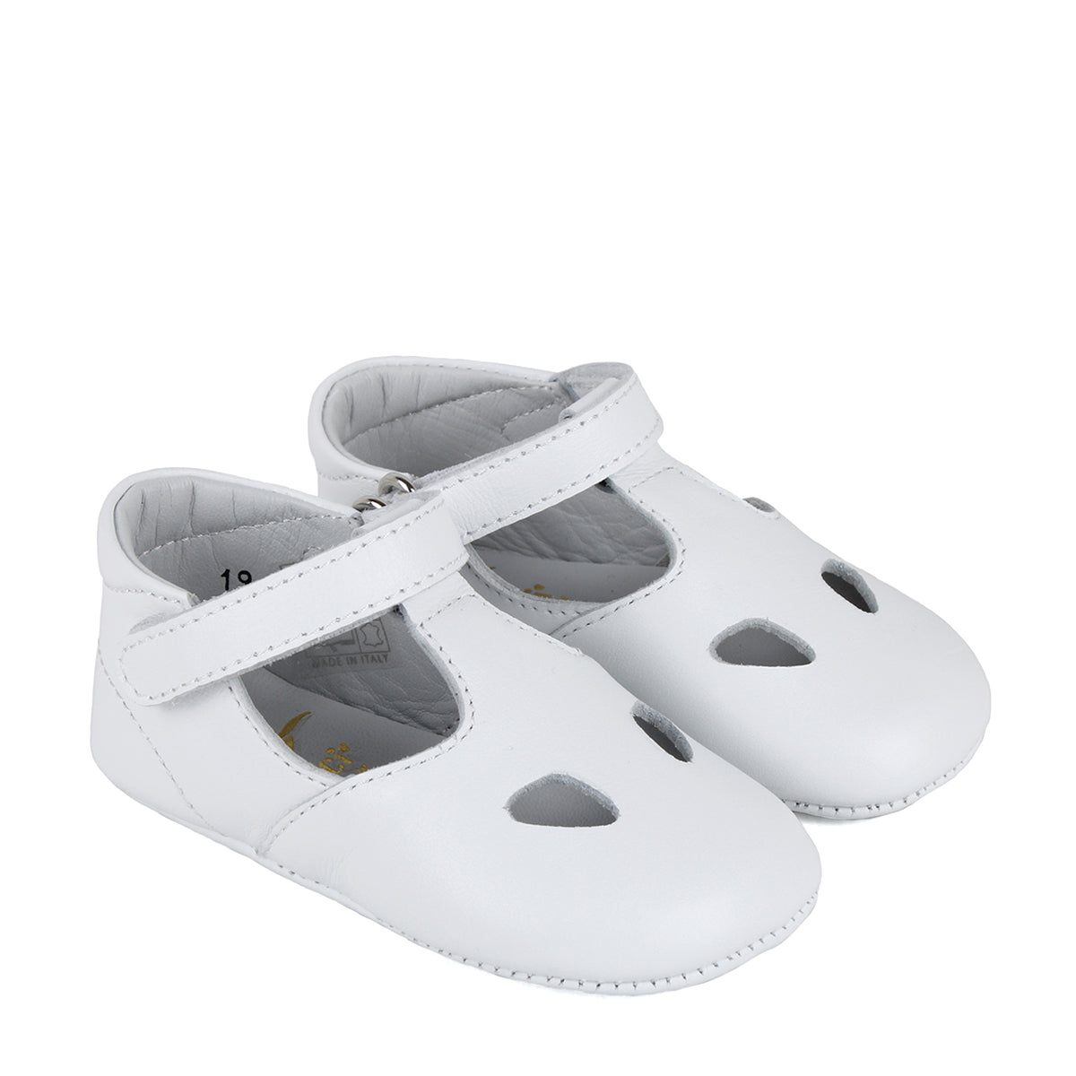 This elegant White Leather T-Bar shoe for newborns is expertly crafted in Italy by skilled artisans. Featuring a hook-and-loop closure and a unique cut-out design, it combines refined style with comfort. The soft leather, ergonomic insole, and rubber sole support your baby's posture while ensuring natural wellness. A sophisticated and high-quality choice, perfect as a thoughtful gift.