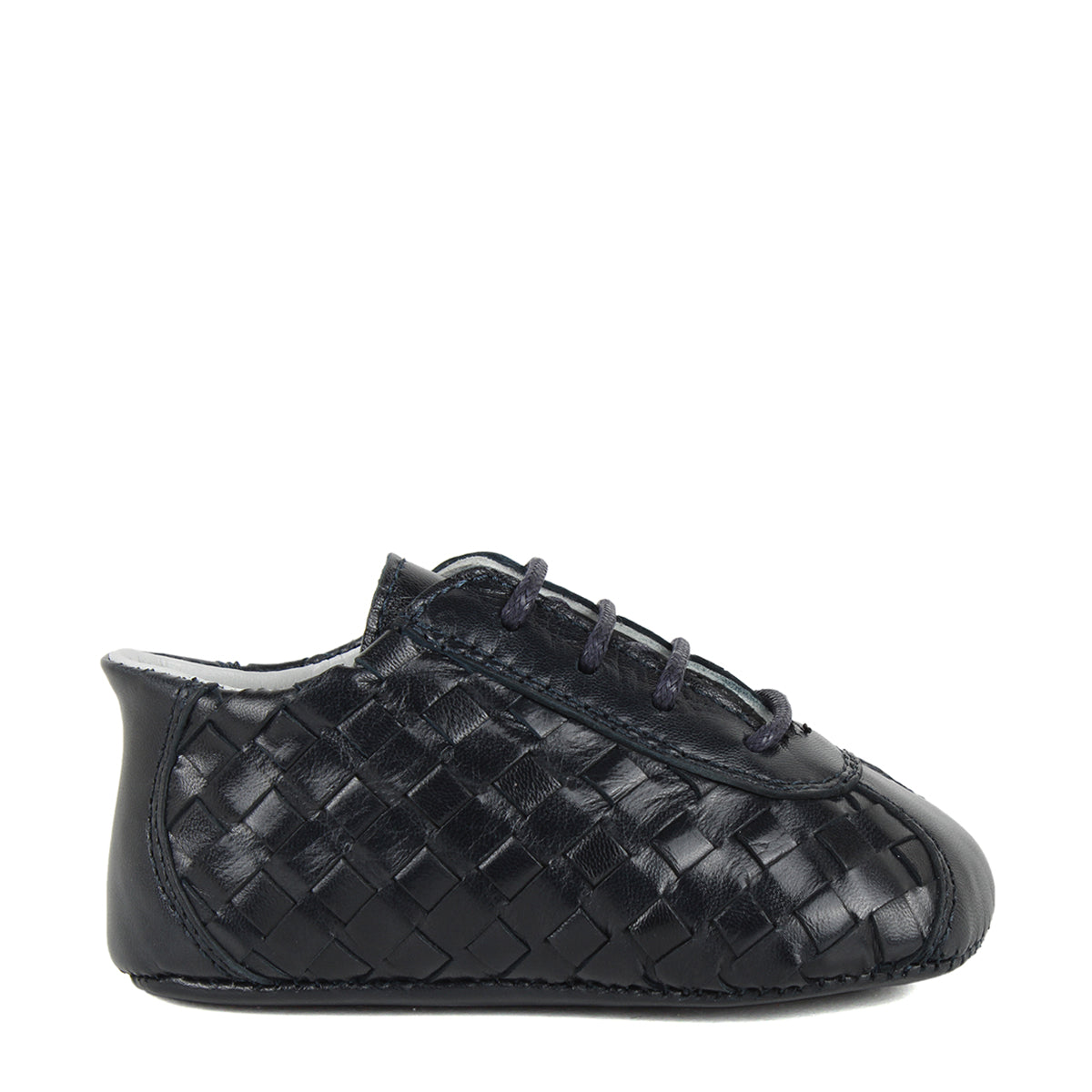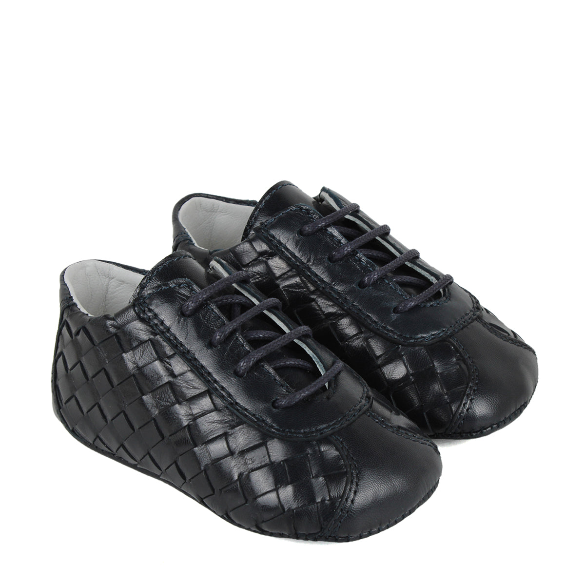 Discover the Navy Woven Calfskin Leather Derby shoes for newborns. Featuring a charming lace-up design and crafted with soft, flexible materials, these shoes offer both comfort and support. The distinctive woven leather adds texture and sophistication, making them a stylish choice. Expertly made in Italy to ensure quality and care for your baby's delicate feet.