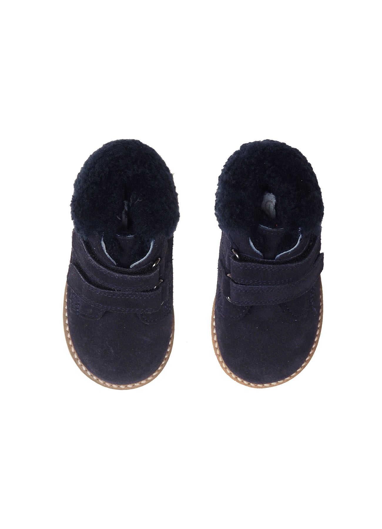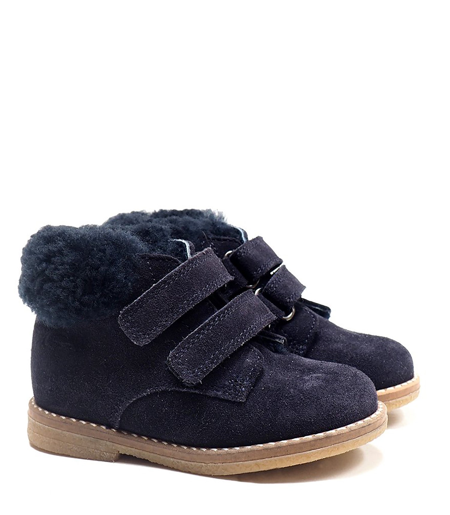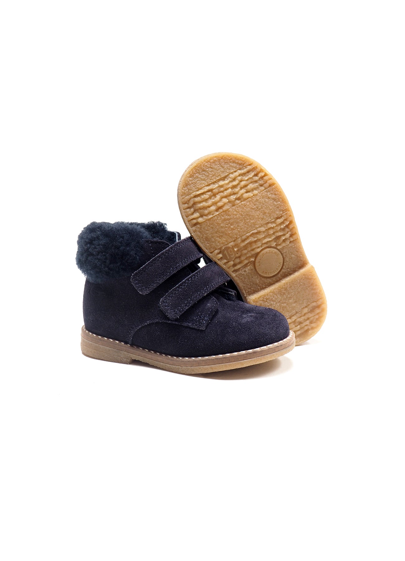 These double strap desert boots feature navy blue suede and a shearling lining on the first straps. Crafted in Italy by skilled artisans using natural materials, they ensure both quality and your child's comfort. The rubber sole provides excellent stability, while the ergonomic insole supports healthy posture. Stylish and thoughtfully designed, these boots combine elegance with well-being for your little one.