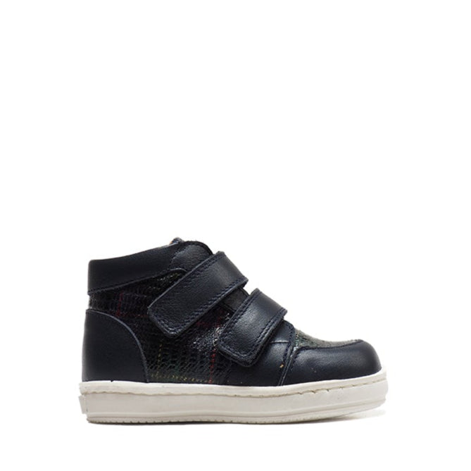 These Double Strap High-Top Sneakers for toddlers combine blu calfskin and tartan fabric, crafted in Italy by skilled artisans using natural materials to ensure your child's comfort and well-being. Featuring a rubber sole for excellent stability and an ergonomic insole designed to support proper posture, these stylish shoes are perfect for your little one's first steps.