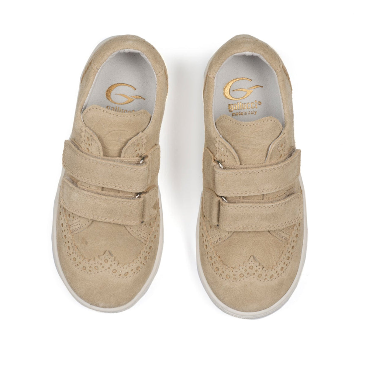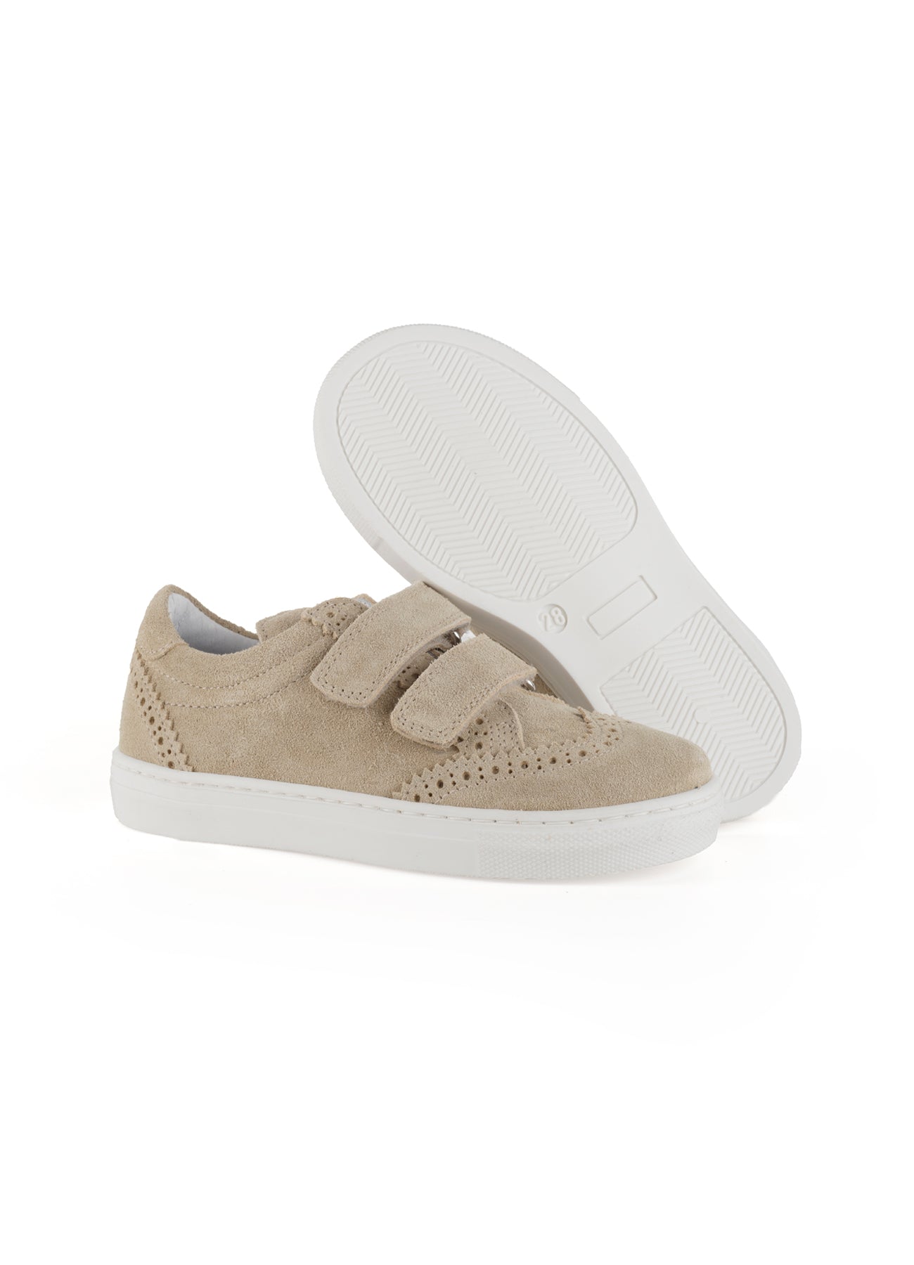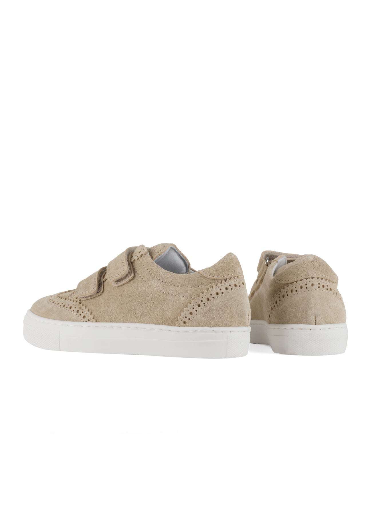 These low-top brogue sneakers feature double straps and are crafted from beige suede leather. Handmade in Italy by skilled artisans using natural materials, they ensure both quality and your child's comfort. The rubber sole provides excellent stability, while the ergonomic insole supports healthy posture. Stylish and thoughtfully designed, these sneakers combine elegance with well-being for your child.