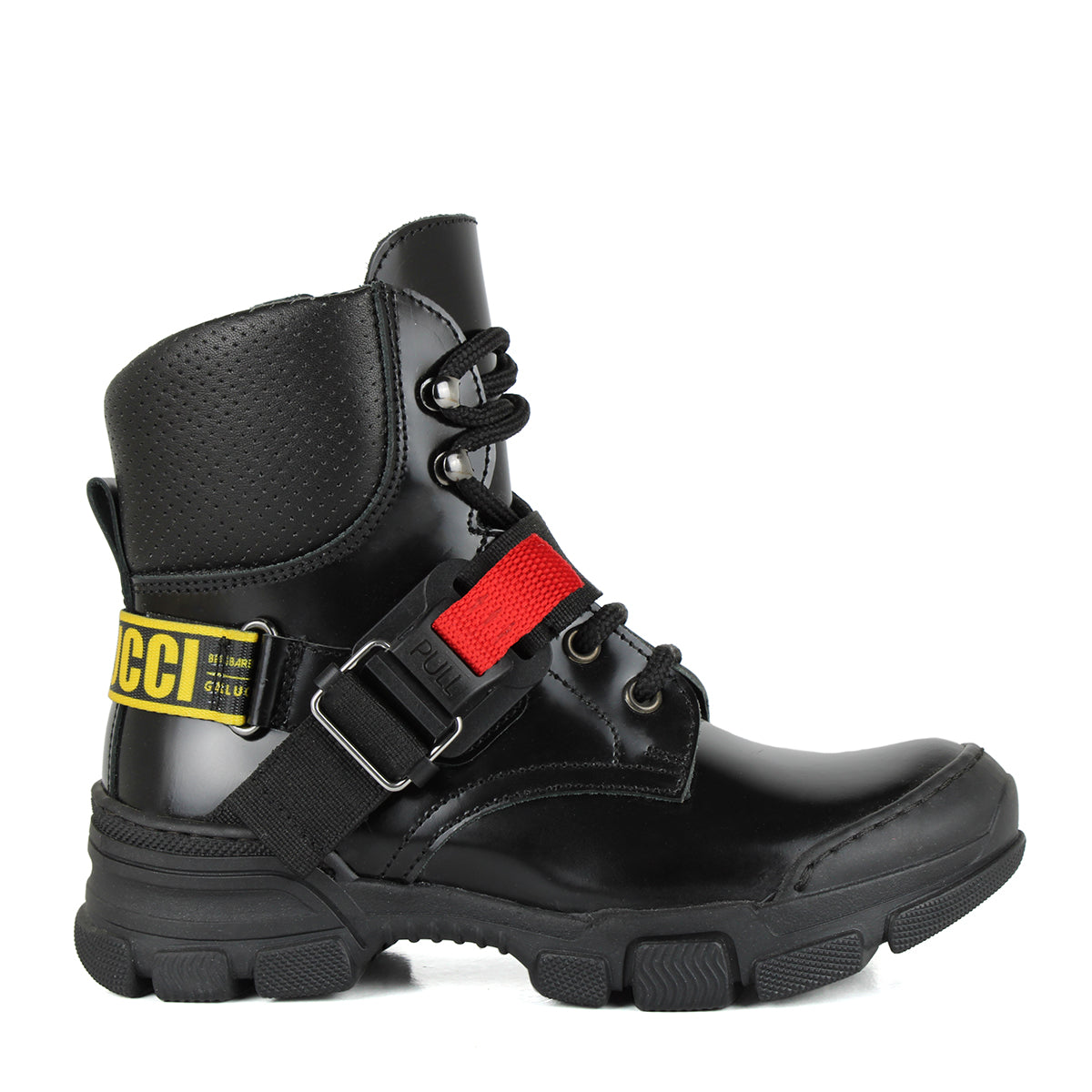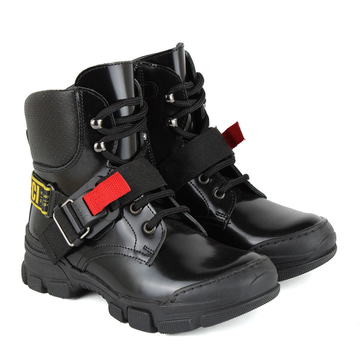 Elegantly crafted ankle boot featuring distressed calfskin leather, distinctive hook detail, and signature logo tape. The technical rubber sole complements an ergonomic insole, ensuring optimal posture support for your child. Handmade in Italy by skilled artisans using natural materials that prioritize your baby's well-being. A sophisticated fusion of chic aesthetics and premium quality craftsmanship.