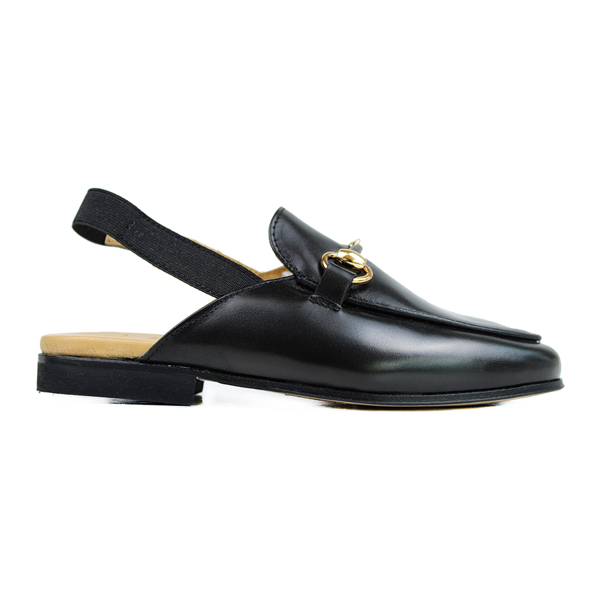 This black leather penny-style sabot with a back strap combines elegance and comfort. Crafted in Italy by skilled artisans using natural materials, it ensures quality and your child's well-being. The rubber sole provides excellent stability, while the ergonomic insole supports proper posture, making it both stylish and beneficial for your child.