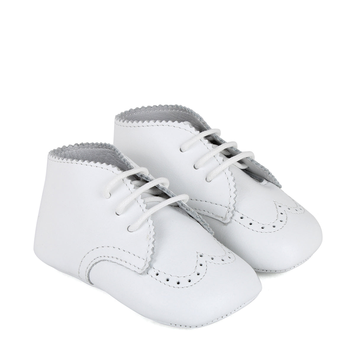 These white leather baby derby shoes feature a delicate lace-up closure, complemented by a gently curved collar and subtle brogue detailing. Made from soft, supple leather, they ensure exceptional comfort. Expertly crafted in Italy by skilled artisans using natural materials, these shoes prioritize your child's well-being. The sole is fashioned from fine calfskin leather, combining quality and elegance.