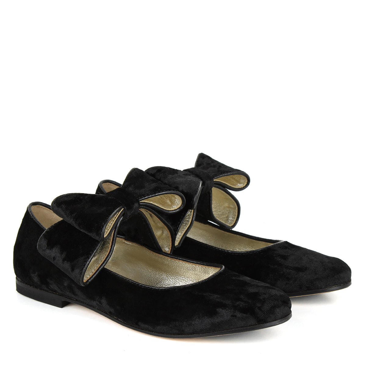 Elegant ballerinas crafted from black velvet leather, adorned with a refined bow on top. Expertly made in Italy by our artisans using natural materials to ensure premium quality and your child's comfort. Featuring a rubber sole for enhanced stability and an ergonomic insole designed to support your child's posture.