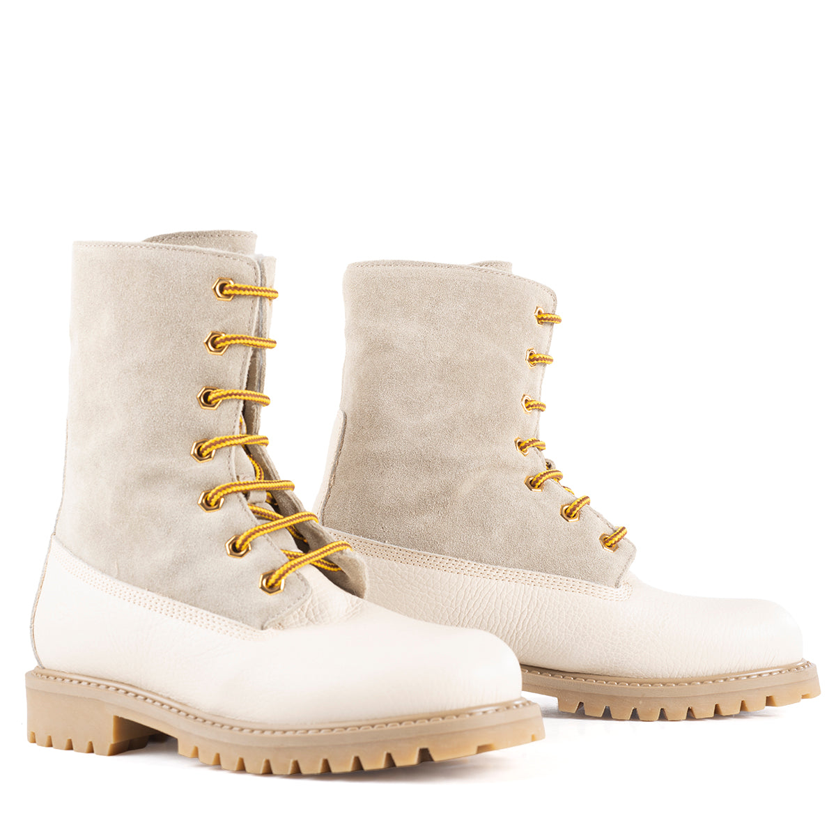 Crafted in Italy by skilled artisans, these white elk leather boots feature a shearling leather lining and secure laces. Made from natural materials, they prioritize your child's comfort and well-being. The rubber sole ensures stability, while the ergonomic insole supports proper posture, combining style with thoughtful design.