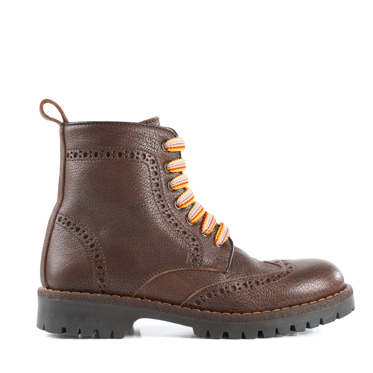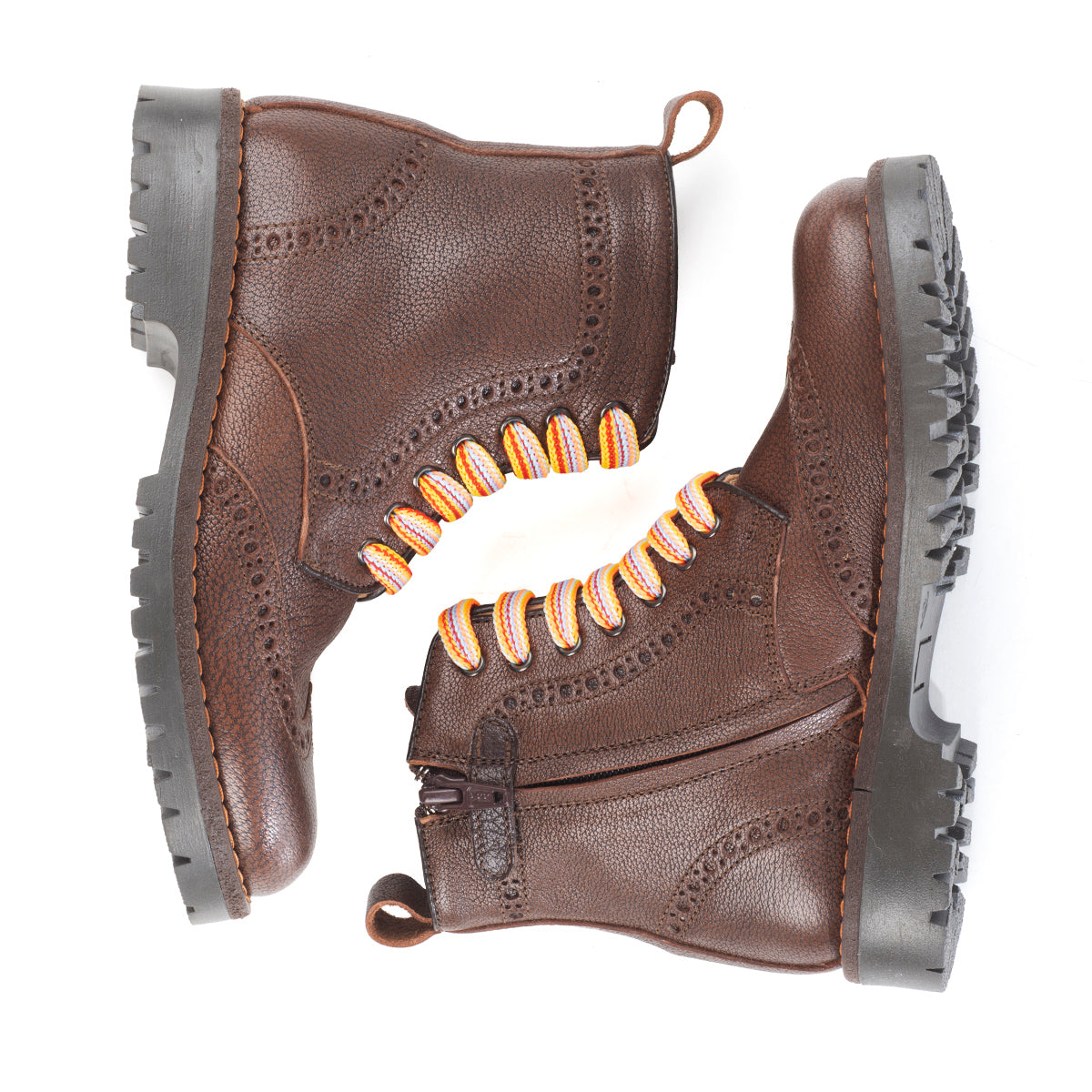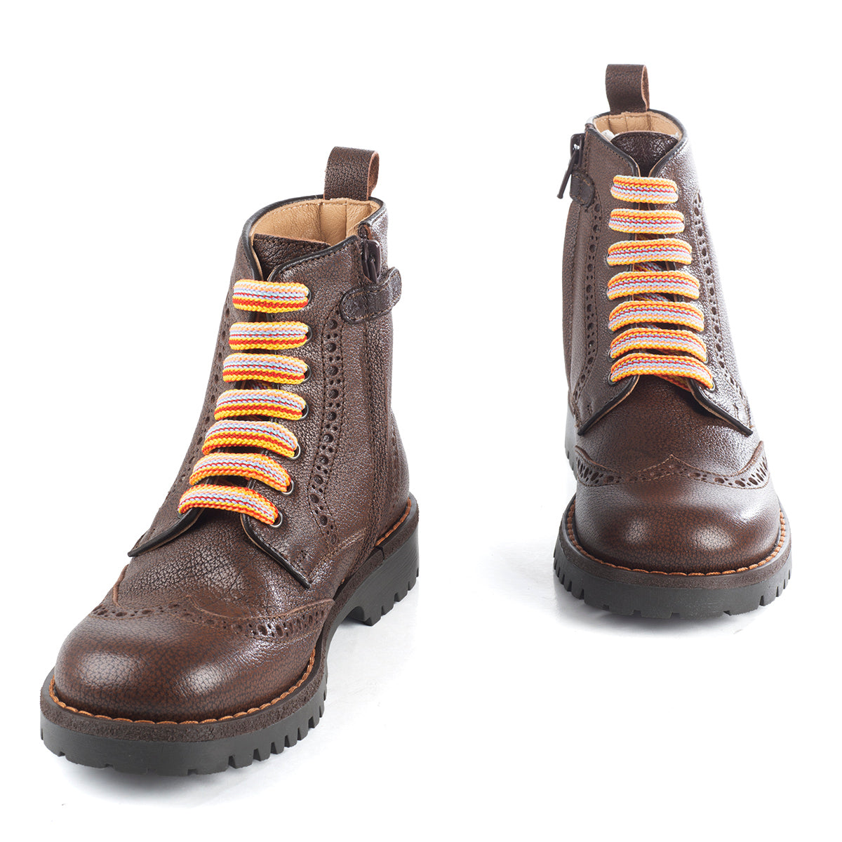These boots feature brown buffalo leather and multicolor laces , ideal for outdoor adventures. Crafted in Italy by skilled artisans using natural materials, they ensure both quality and your child's comfort. The rubber sole provides excellent stability, while the ergonomic insole supports healthy posture. Stylish and practical, these boots are perfect for active days in the mountains.