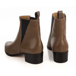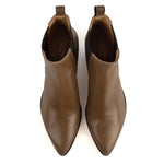 This elegant pair of tan calfskin leather ankle boots showcases the timeless Chelsea boot silhouette with elastic side panels for effortless slip-on convenience. Featuring a pointed toe and a comfortable 40-millimetre low block heel, they combine style and practicality. A discreet pull tab at the back enhances ease of wear. Expertly handcrafted in Italy from natural calfskin by skilled artisans, these boots offer refined sophistication and comfort, making them an essential addition to any woman’s wardrobe.