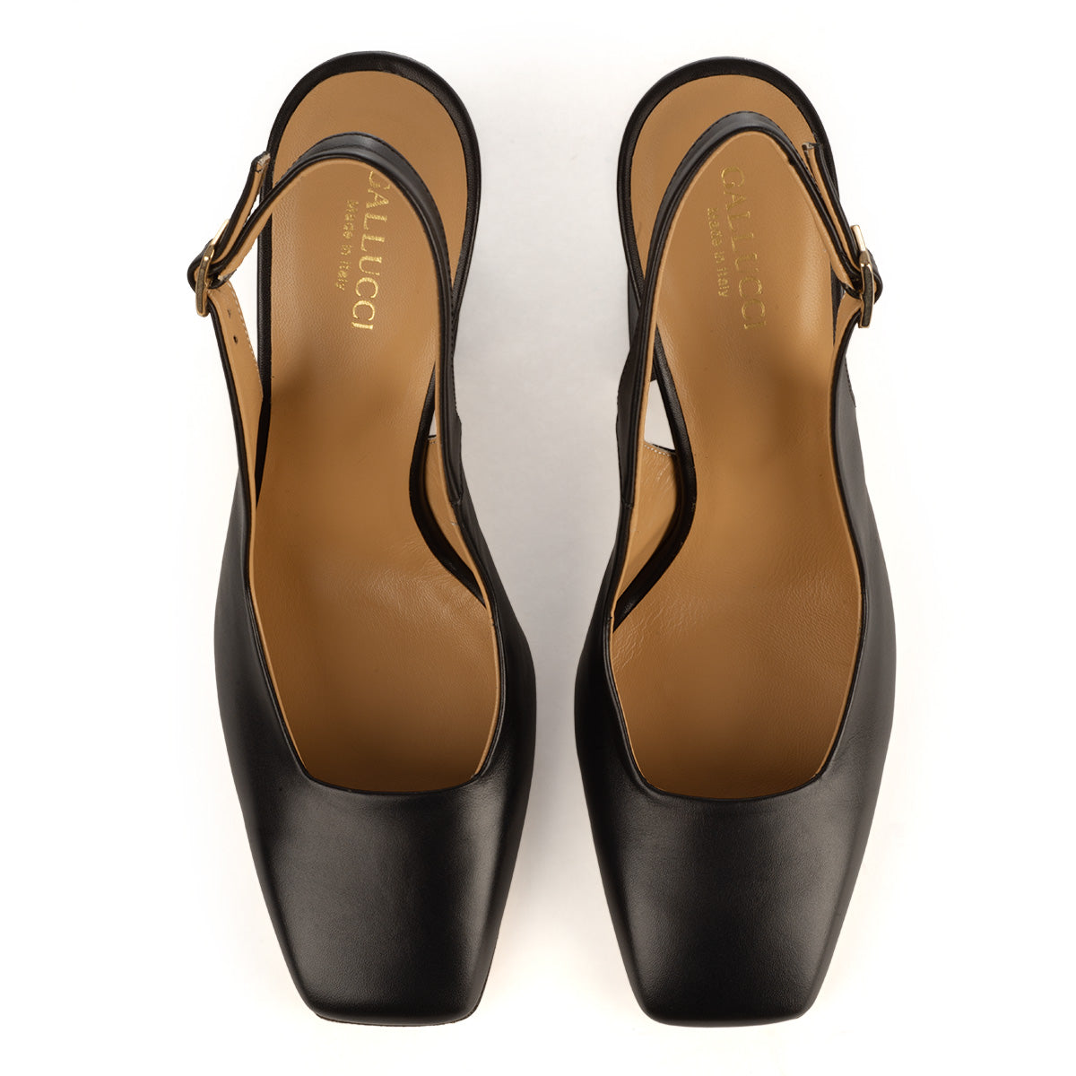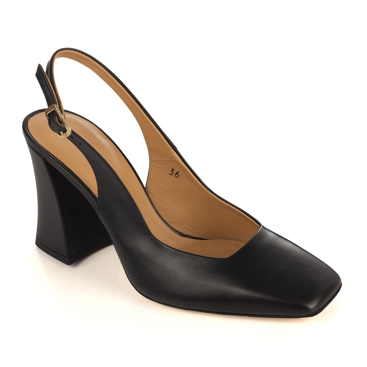 This refined pair of black pumps showcases a sleek square toe and a striking sculptural block heel. Featuring a slingback strap with a gold-tone buckle, they offer both elegance and secure fit. The upper includes a distinctive cut-out on the vamp, lending a contemporary edge. Crafted from premium calfskin leather and meticulously handmade in Italy, these shoes blend sophisticated style with superior comfort. Heel height: 80 millimetres.