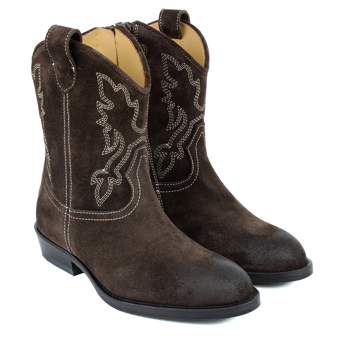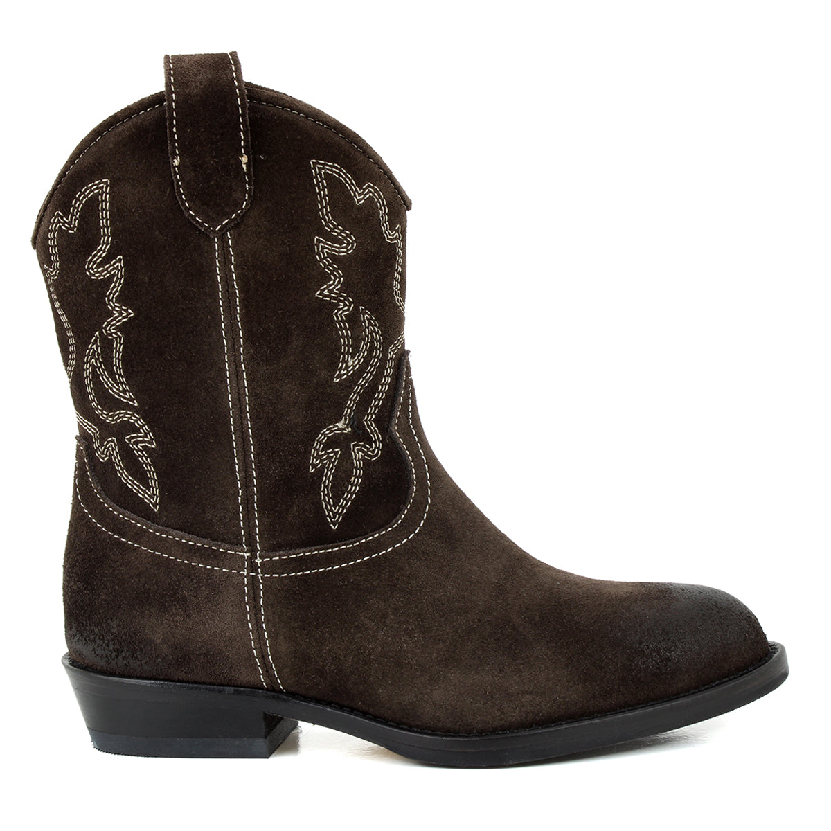 Exquisitely crafted brown suede Texan boots adorned with refined white accents, designed specifically for discerning young ladies. Meticulously handcrafted in Italy by our master artisans, these elegant footwear pieces incorporate natural elements to support proper posture development. A sophisticated Italian creation that combines style with thoughtful ergonomic design.