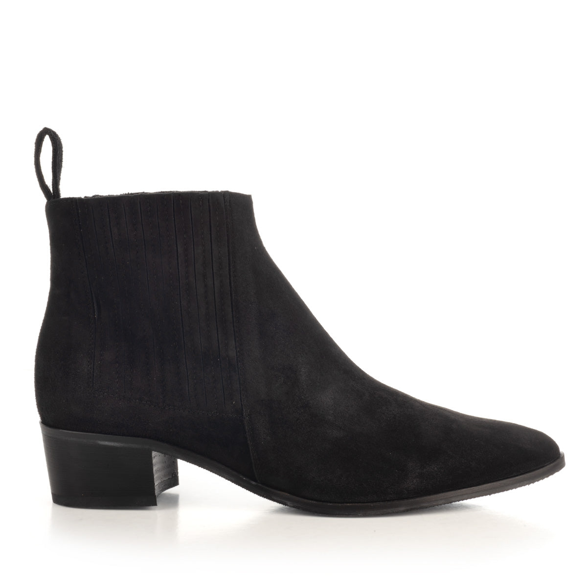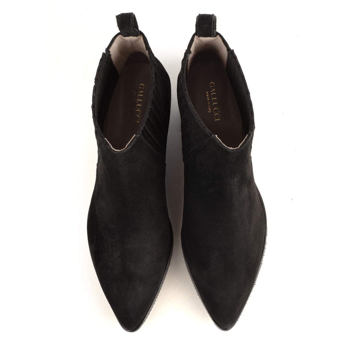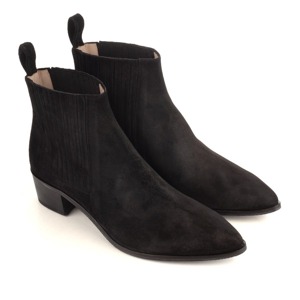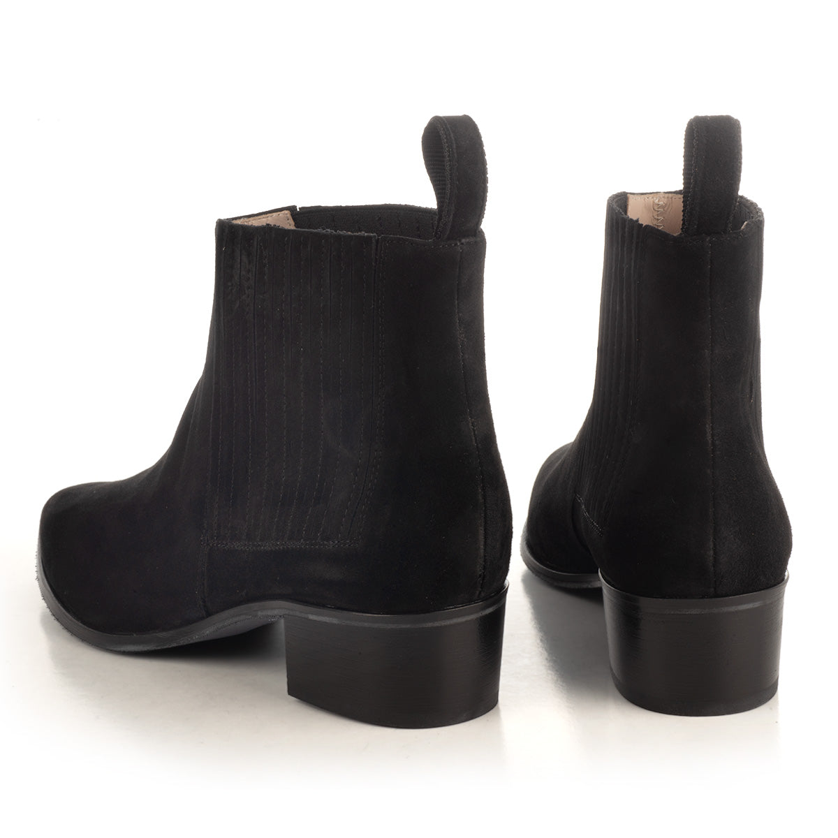 These elegant black ankle boots are made from supple suede, showcasing a pointed toe and a modest 40mm stacked block heel for both style and comfort. The ankle-high shaft features a subtle side zipper or elastic panel for effortless wear, complemented by a discreet pull tab at the back. Meticulously handcrafted in Italy from natural calfskin by expert artisans, these boots embody refined sophistication and are a timeless staple for any discerning wardrobe.
