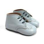 Newborn baby brogue shoes crafted from mint calfskin leather, featuring delicate laces. Expertly handmade in Italy by our artisans using natural materials to ensure exceptional quality and comfort for your little one. Finished with a leather sole for durability and elegance.