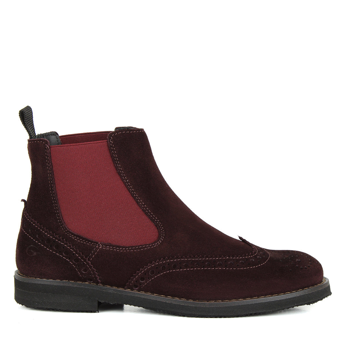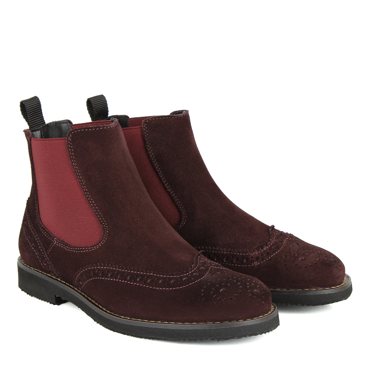 Bordeaux suede Chelsea brogue boot featuring a lightweight rubber sole and ergonomic insole. Crafted in Italy by skilled artisans using natural materials to promote your child's well-being. Designed with posture support in mind, this boot combines elegance with exceptional quality.