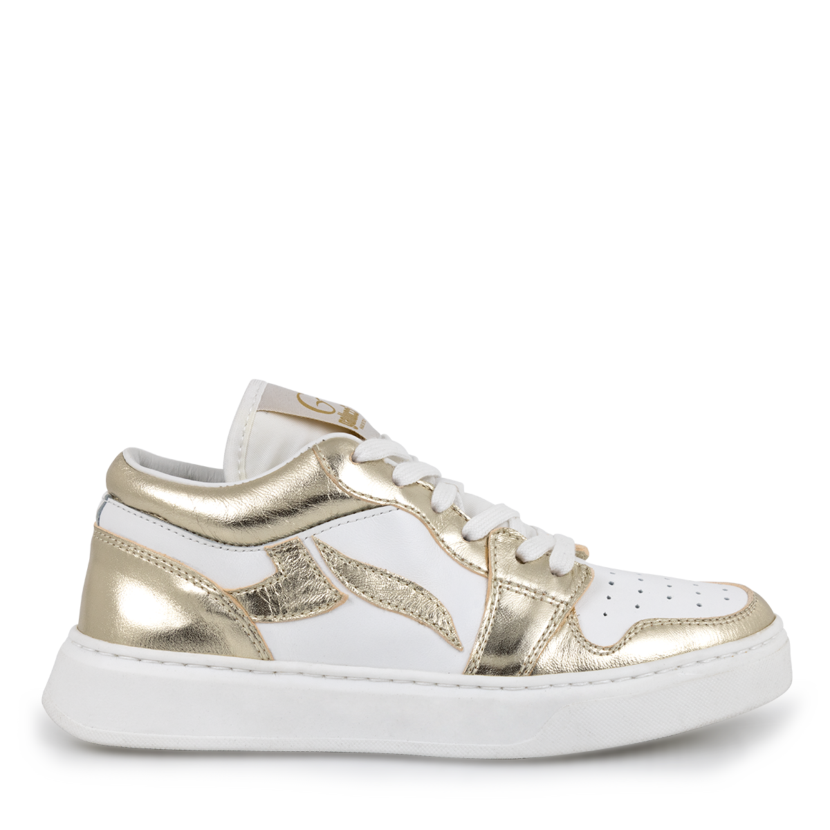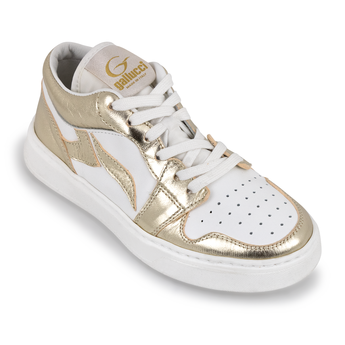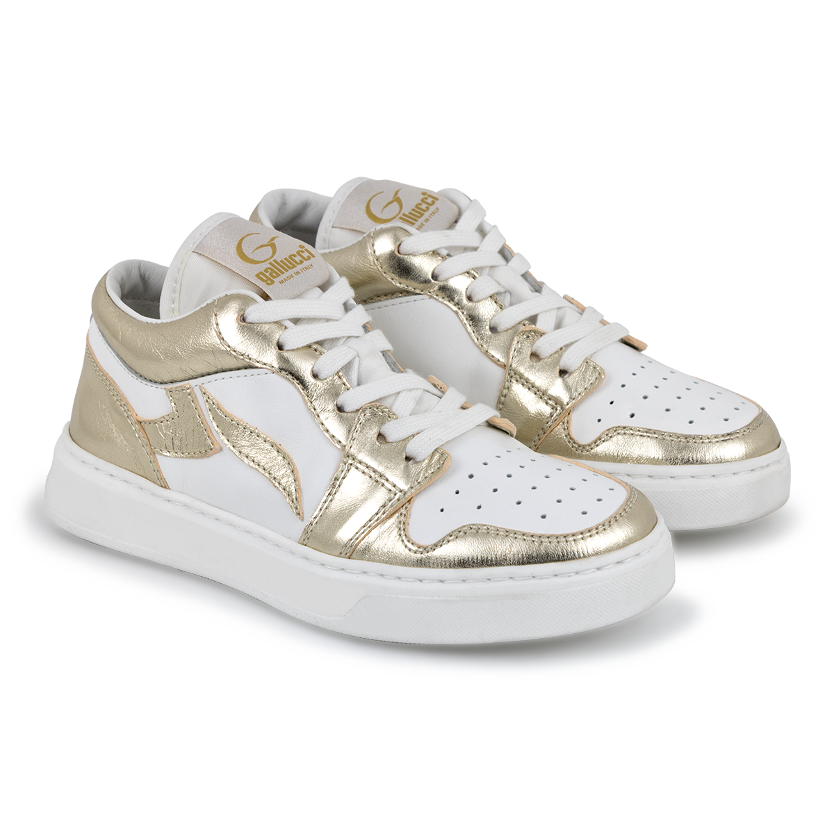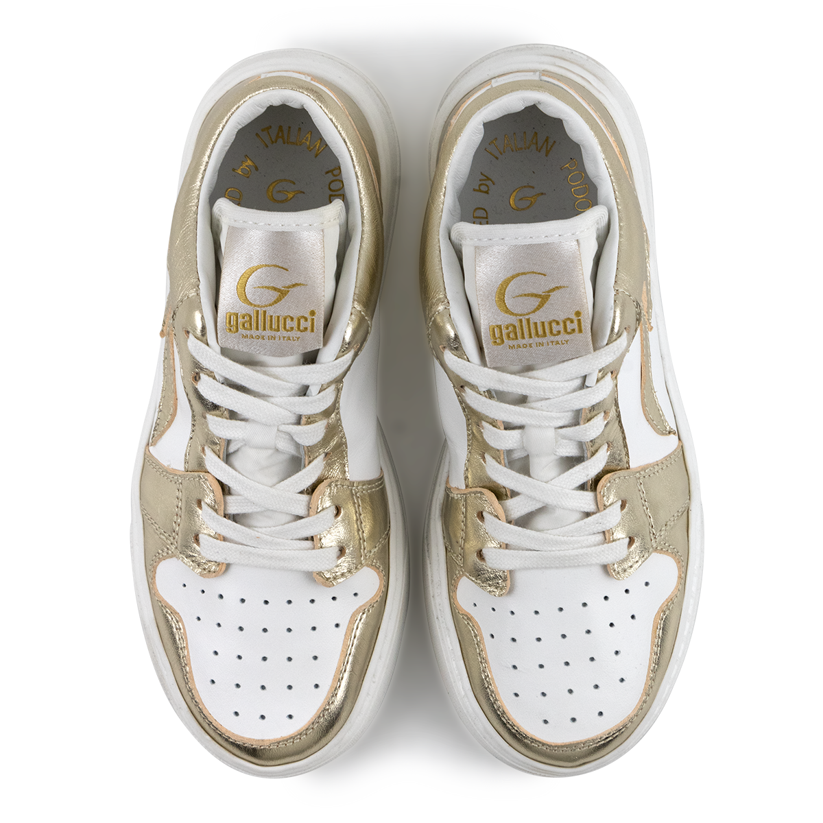Exquisite gold laminated leather sneakers crafted with precision from white calf skin and platinum laminate accents, offering a refined touch of luxury to elevate your ensemble. The sumptuous calf-skin lining paired with a durable rubber sole delivers exceptional comfort without compromising on sophistication. Meticulously handcrafted in Italy by skilled artisans using natural materials, these premium footwear pieces support proper posture while embodying the pinnacle of Italian craftsmanship and elegant design.