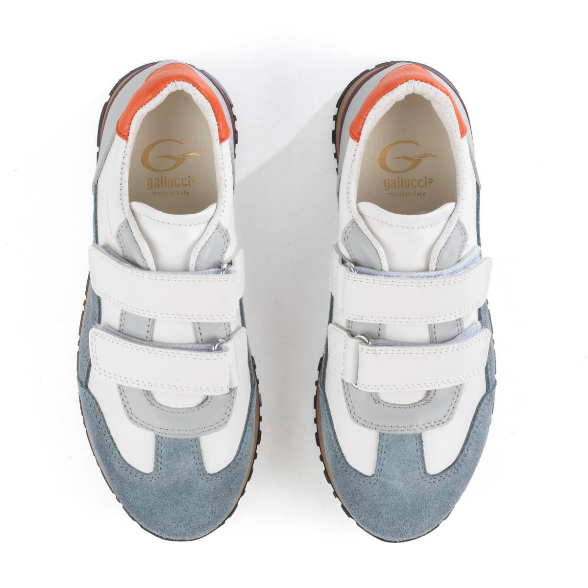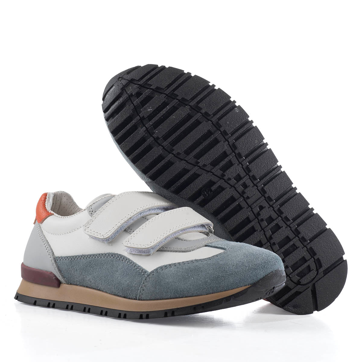 These multicolour sneakers feature dual Velcro straps crafted from white calfskin leather, combined with grey, black, and orange suede accents, perfectly suited to your child's style. Expertly handmade in Italy by our artisans using natural materials, they ensure exceptional quality and comfort. The rubber sole provides reliable stability, while the ergonomic insole supports healthy posture for your child.