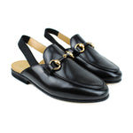 This black leather penny-style sabot with a back strap combines elegance and comfort. Crafted in Italy by skilled artisans using natural materials, it ensures quality and your child's well-being. The rubber sole provides excellent stability, while the ergonomic insole supports proper posture, making it both stylish and beneficial for your child.