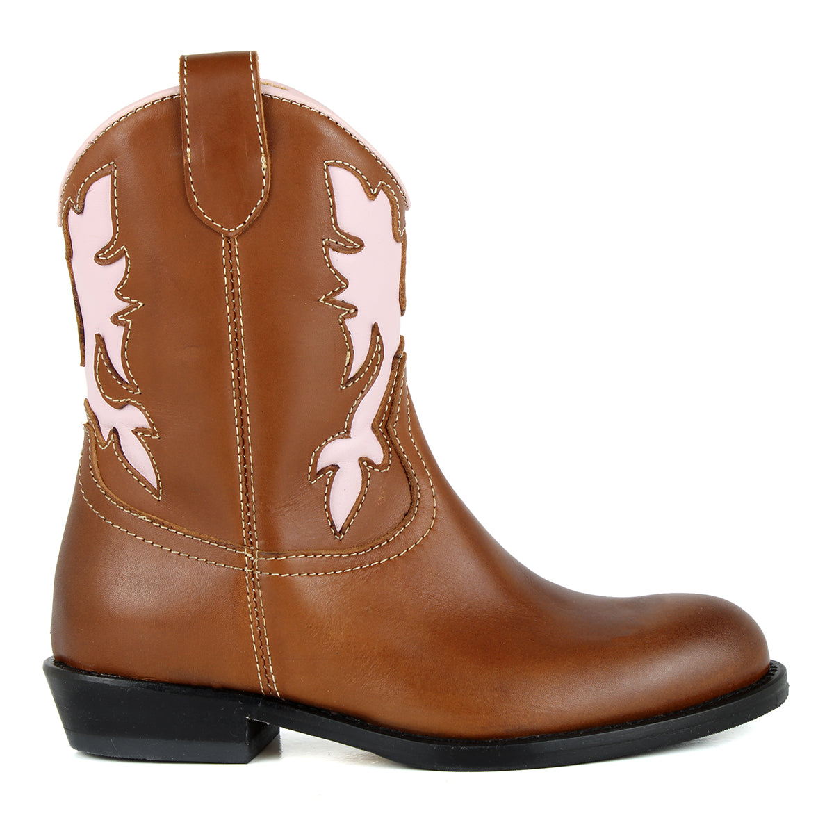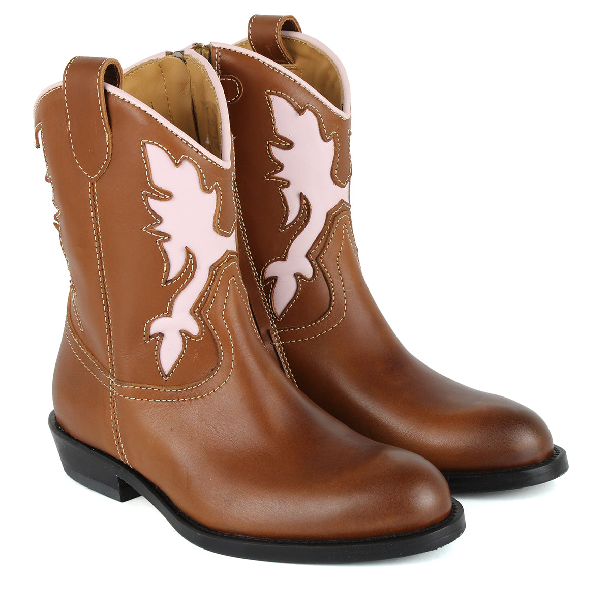 Elevate your little girl's style with these exquisite brown calfskin cowboy boots featuring delicate pink accents. Crafted in Italy by skilled artisans, they combine a leather sole with an ergonomic insole designed to support your child's posture. Made from natural materials to ensure comfort and well-being, these boots are a refined and essential addition to her seasonal wardrobe.